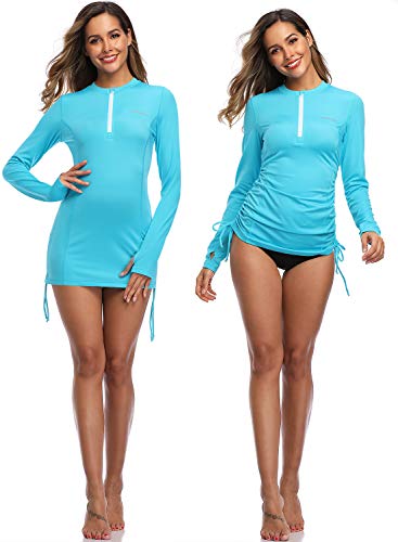 ★Feature-The UPF 50+ sun protection layer will block out the UV radiation and protect your skin whether you are in or out of the water.Long sleeve design gives you more skin protection and protects you from sunburn.The thumb hole and drawstring design to allow a better fit and outline the perfect feminine curve and add feminine charm.